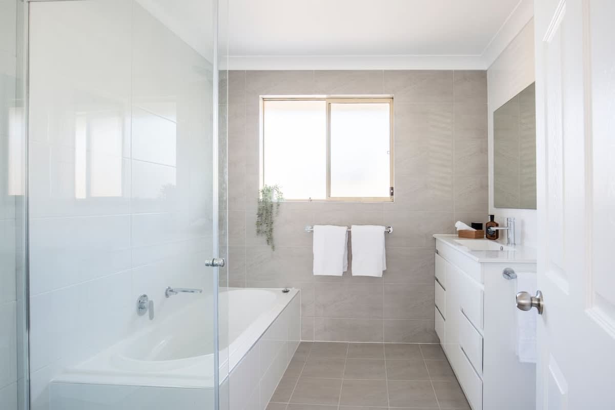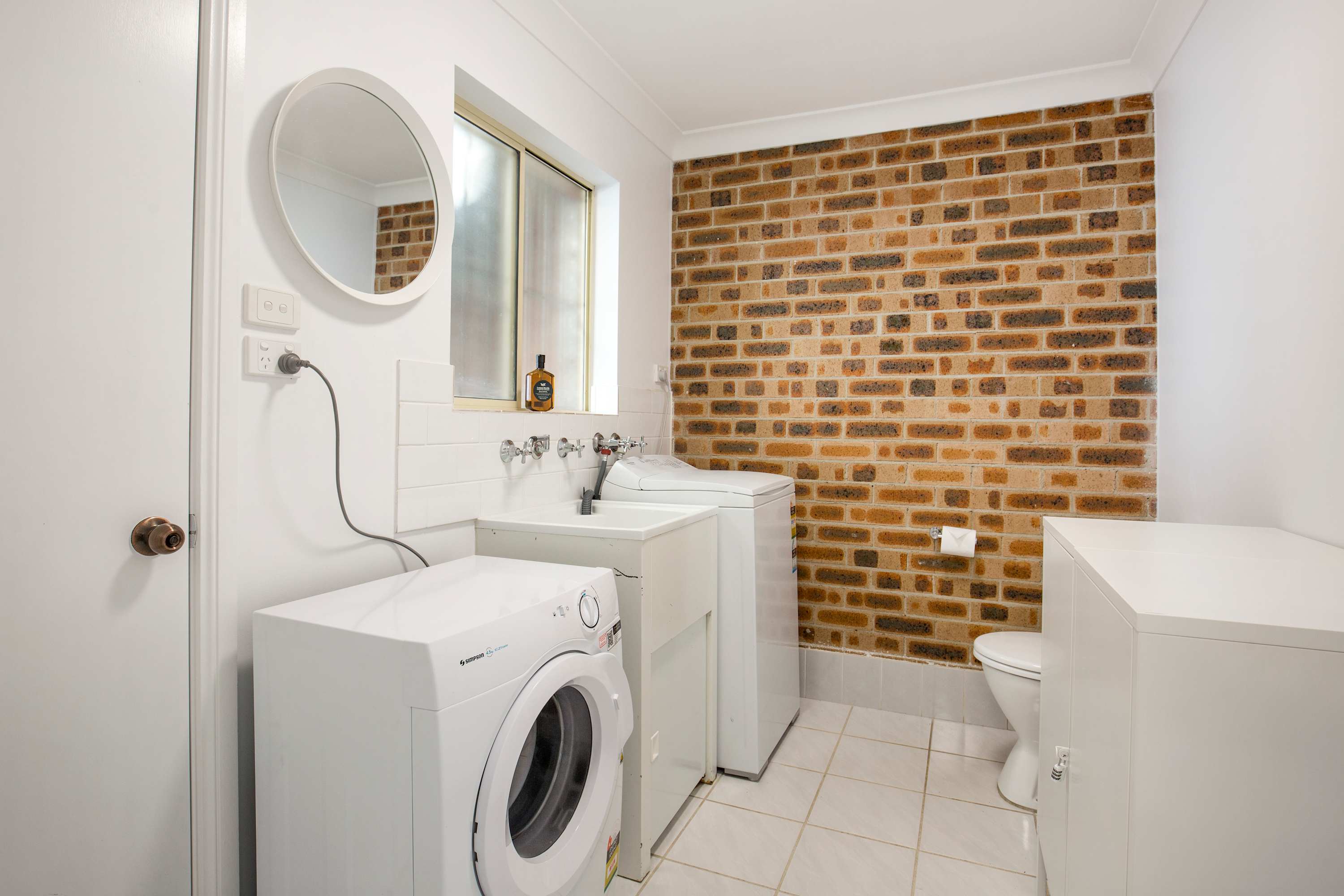 Bathrooms: Main bathroom with shower, bathtub, and toilet; separate toilet in laundry