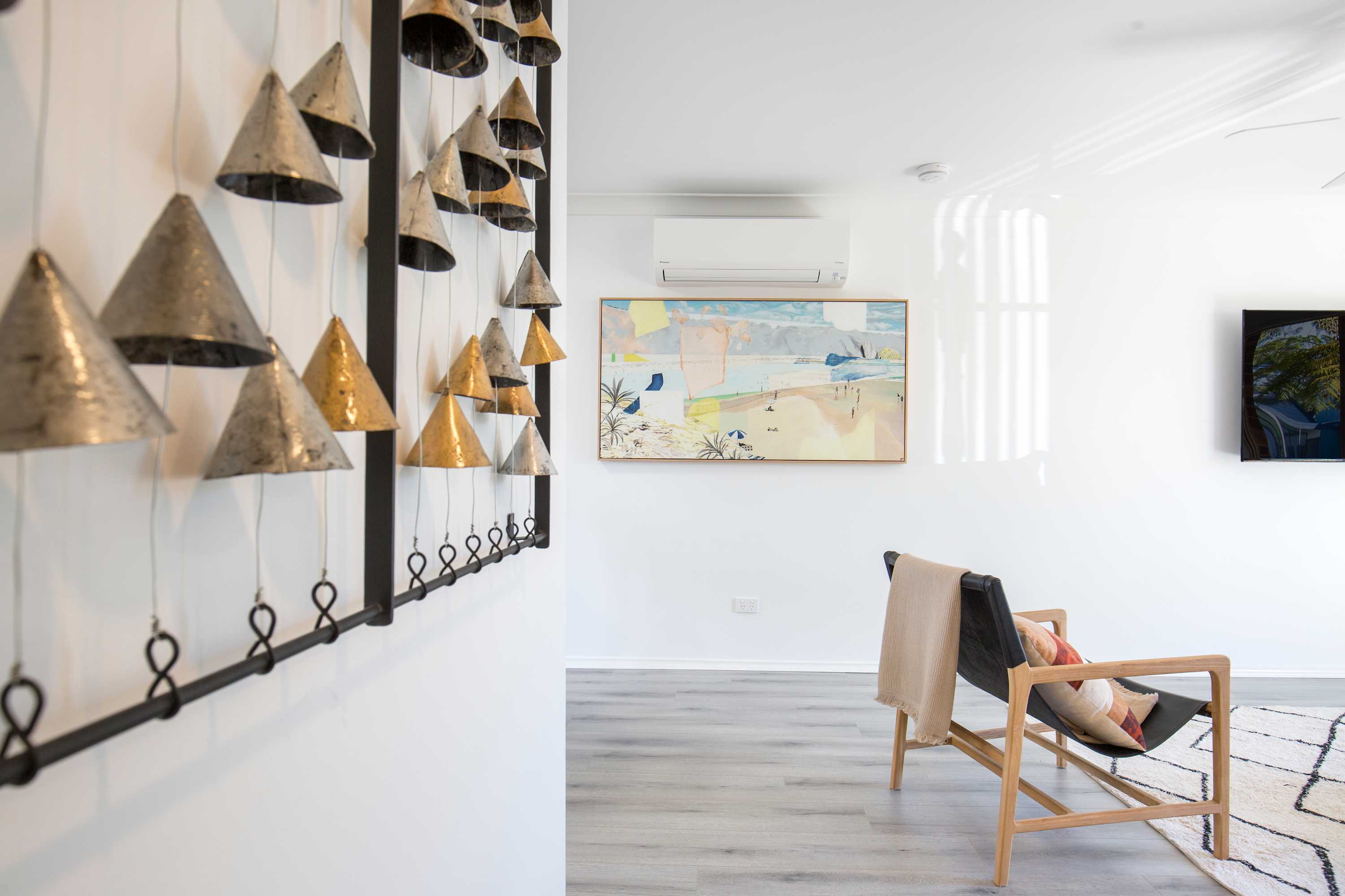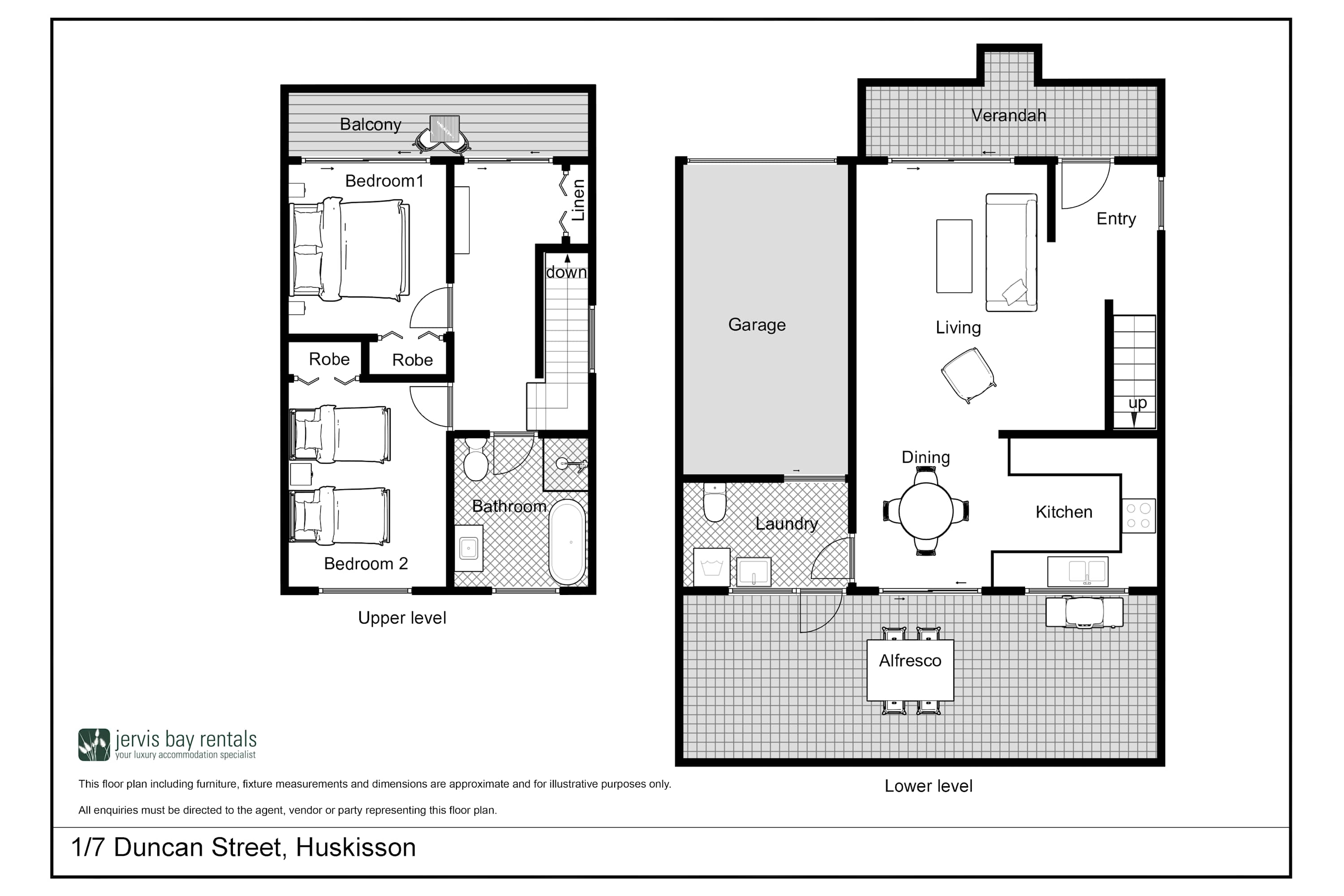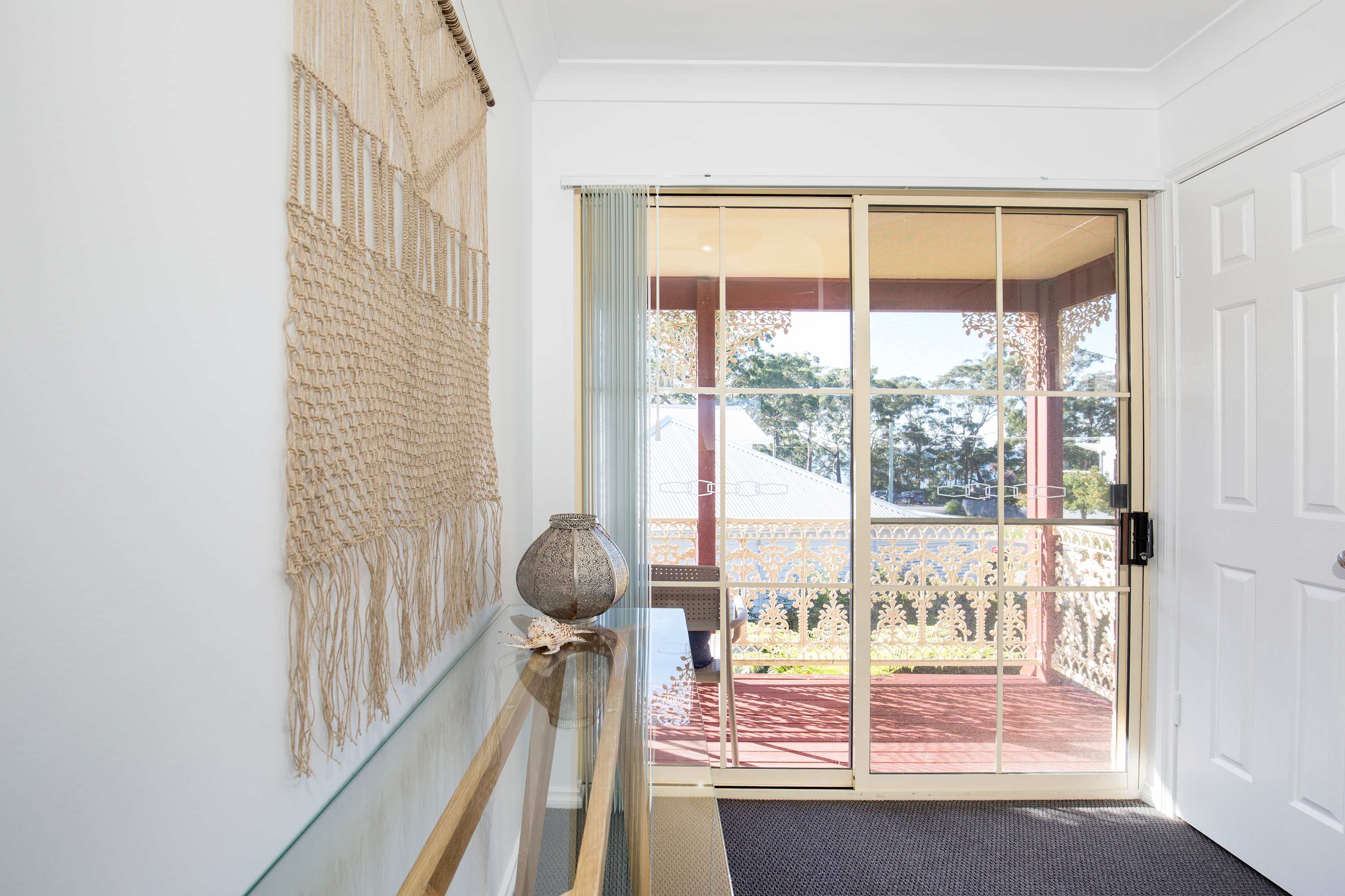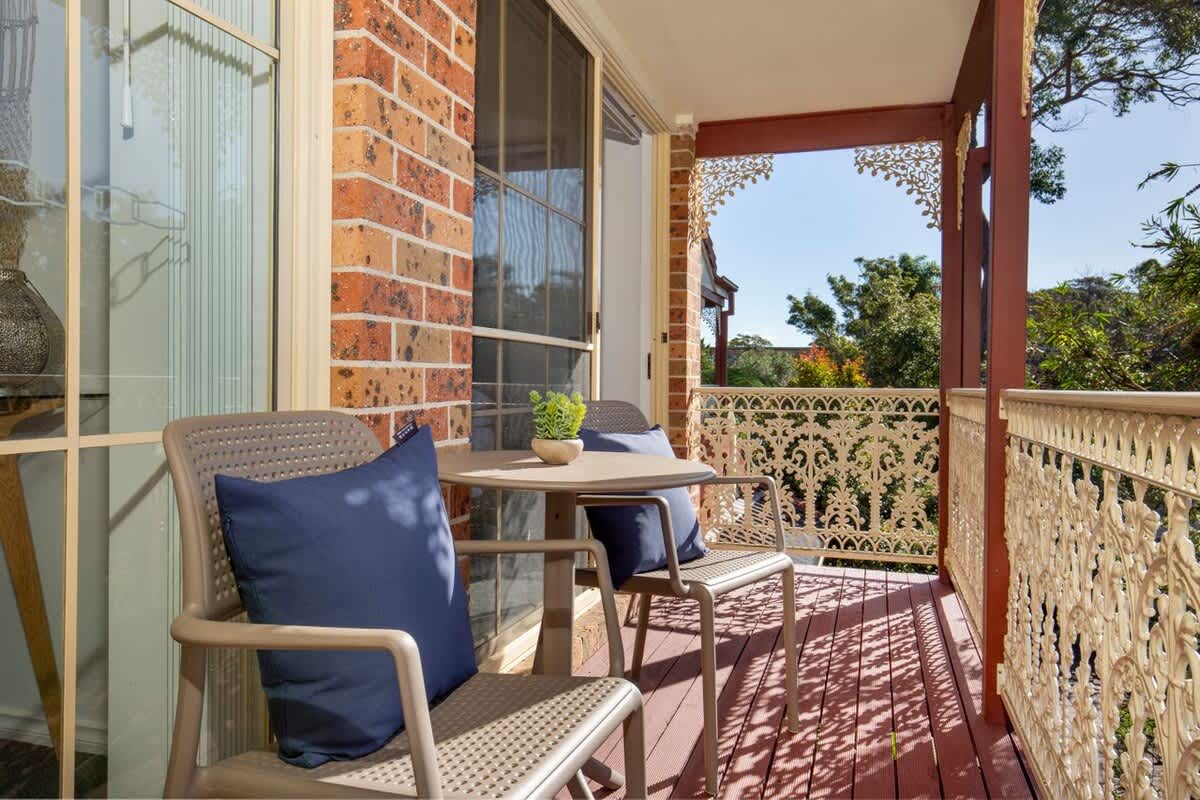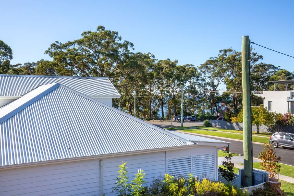 Upstairs, you’ll find two comfortable bedrooms and the main bathroom. The master bedroom opens to a sun-drenched northerly balcony with filtered views of the leafy seaside reserve and sparkling Jervis Bay waters.