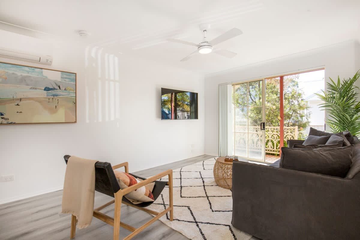 The ground floor features a welcoming, air-conditioned living area with Smart TV and Wi-Fi, a fully equipped kitchen, internal laundry, and a private paved courtyard perfect for outdoor entertaining.