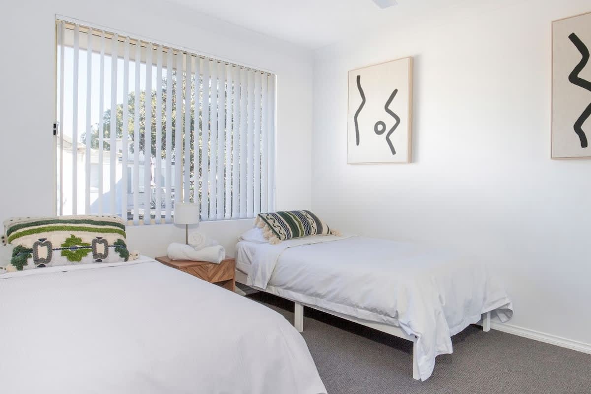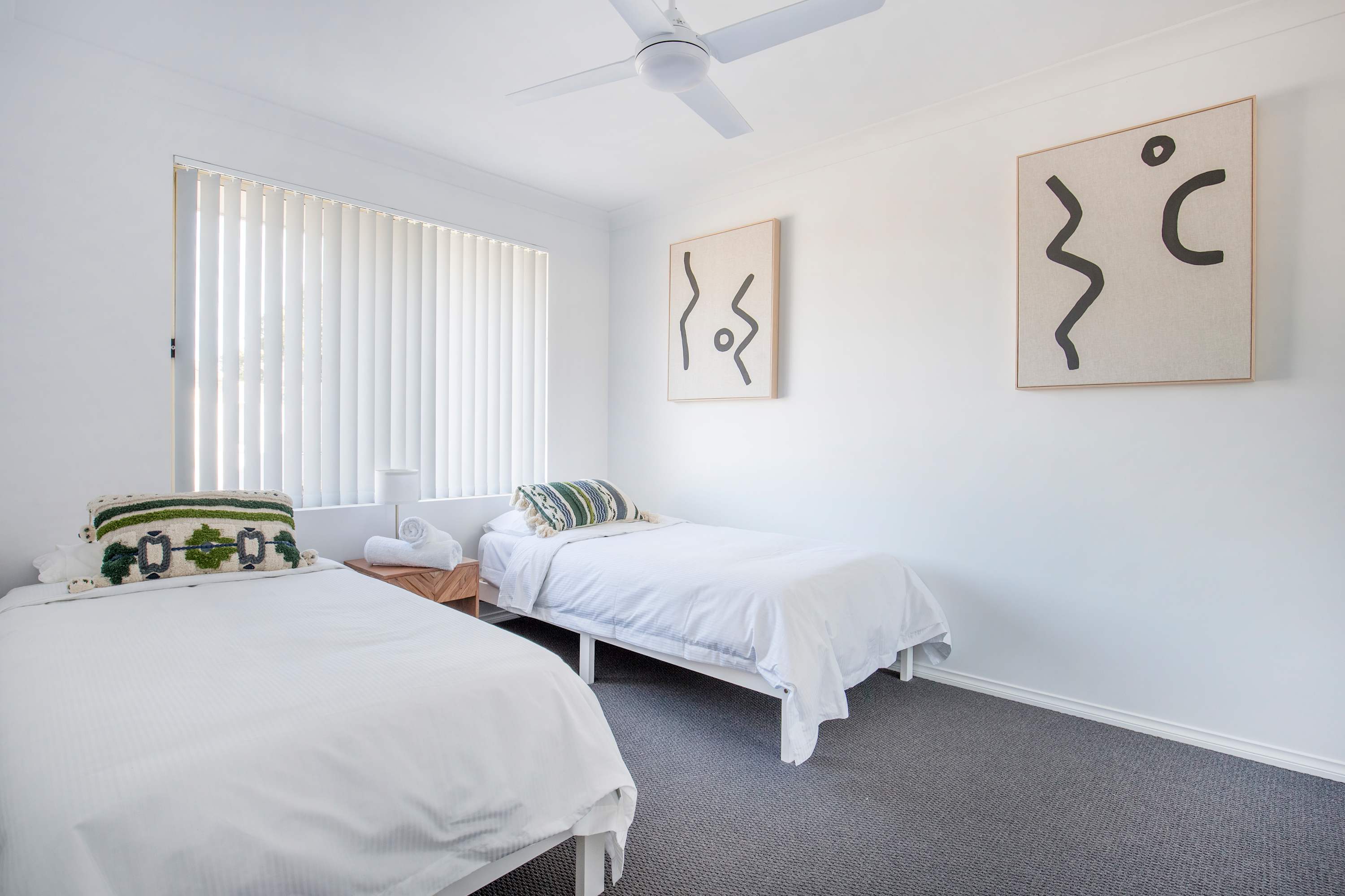 Bedroom 2: Two single beds, built-in robe, ceiling fan