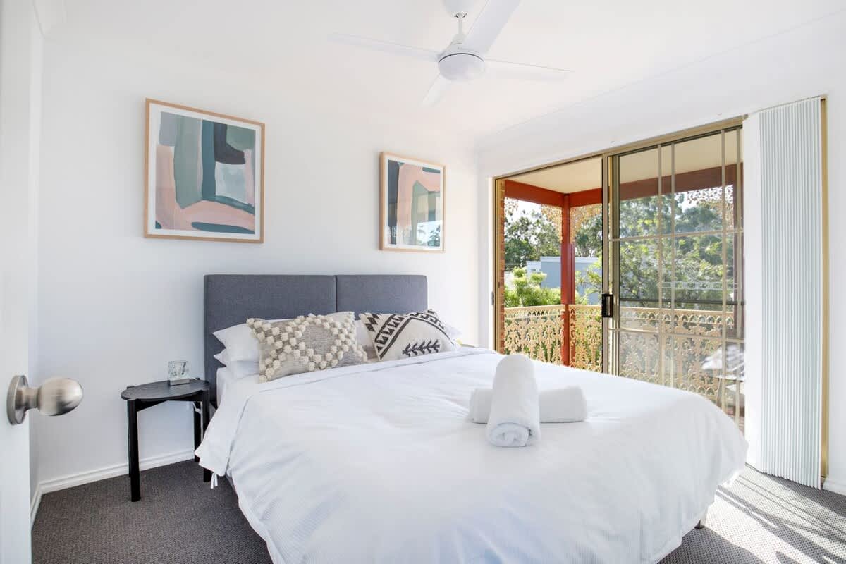 Bedroom 1: Queen bed, built-in robe, ceiling fan, balcony access