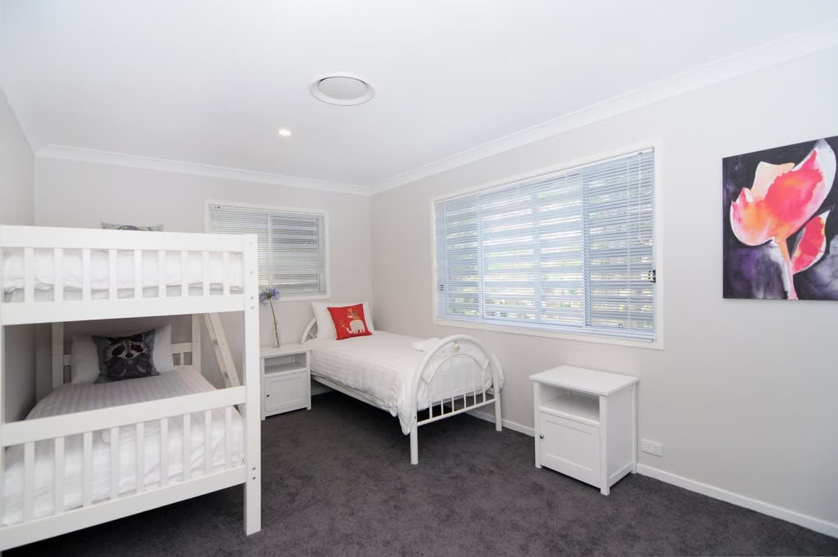 - Bedroom 2 (Upstairs) : Single bunk bed plus additional Single bed, Built-in robe, ducted A/C