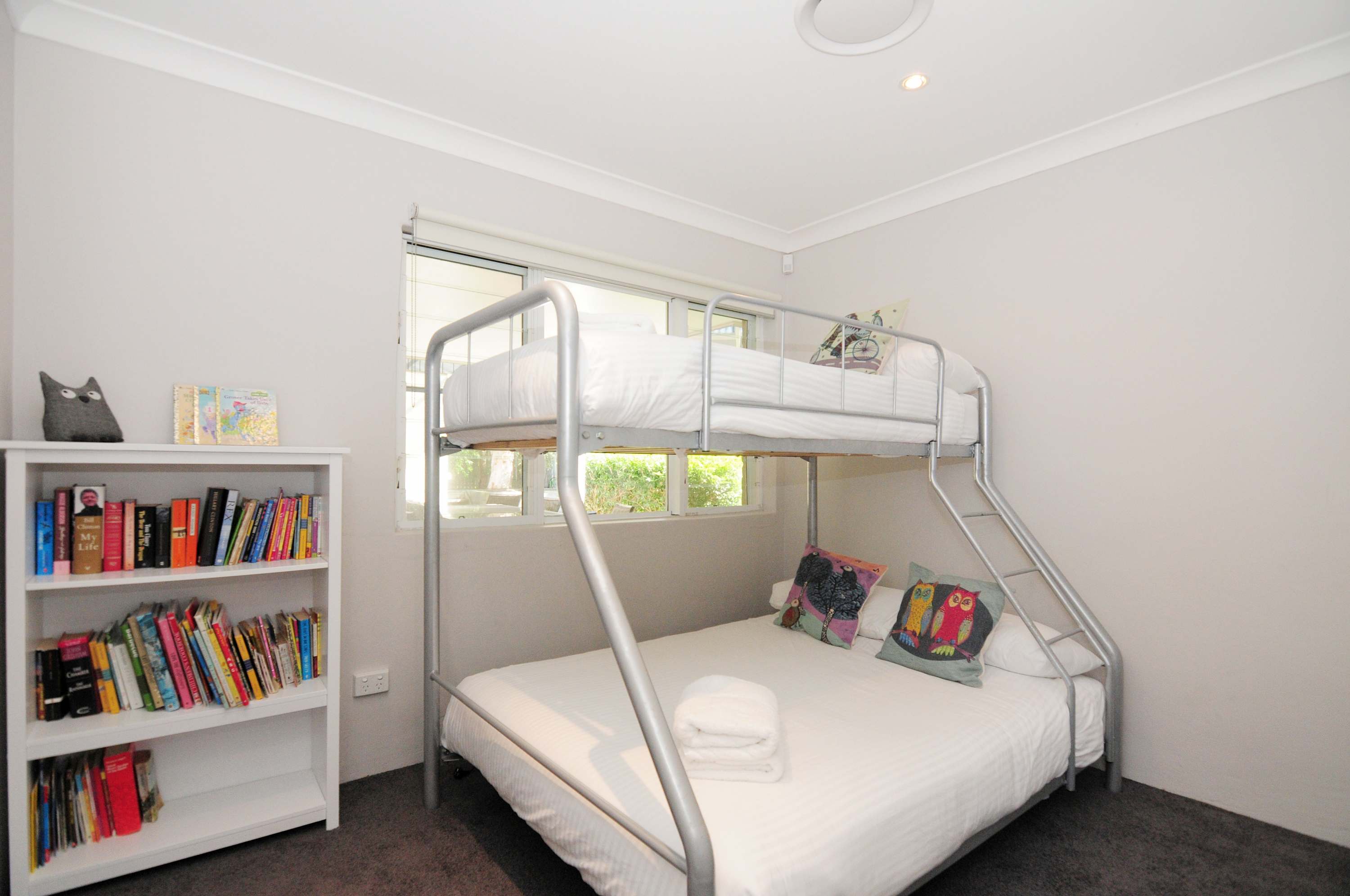 - Bedroom 4 (Downstairs) : Tri-bunk (Double + Single) Built-in robe, pedestal fan/electric heater