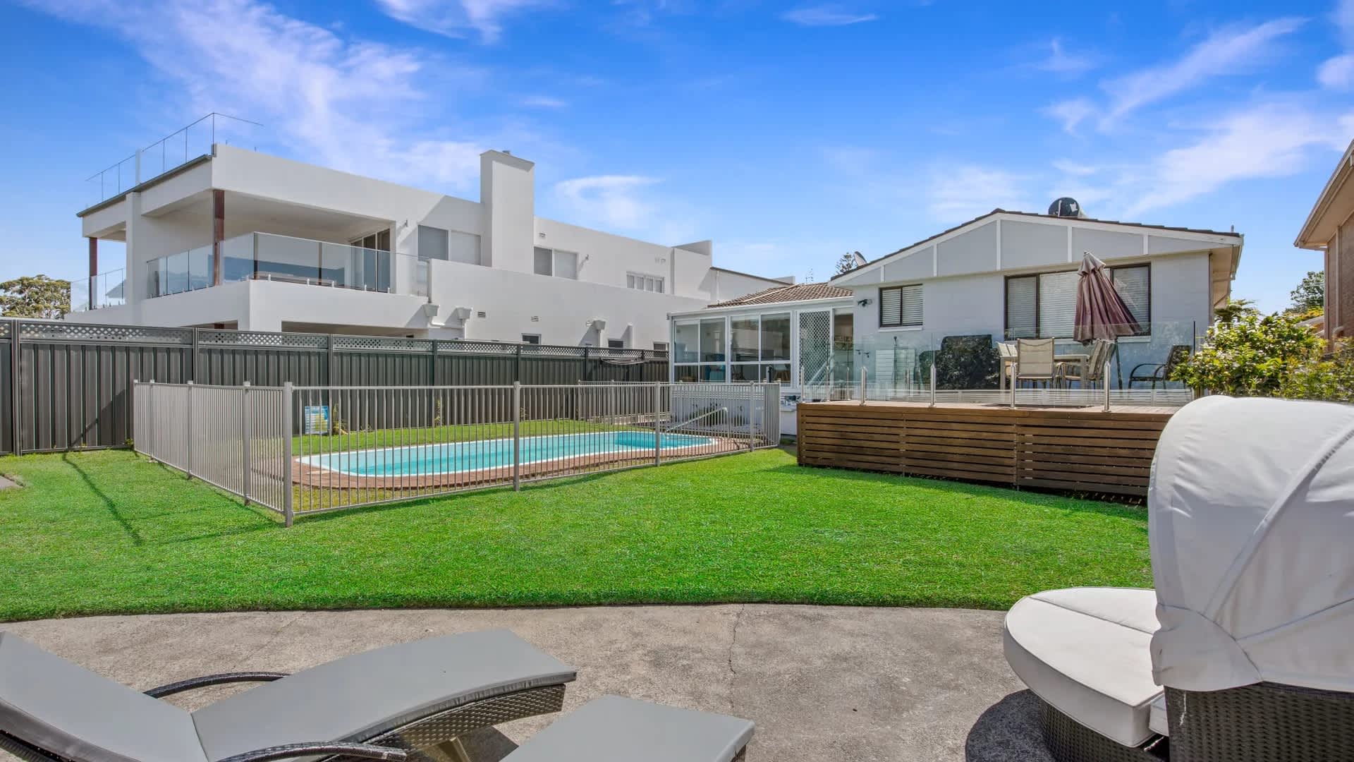 - Outdoor Space: Fully fenced back yard, Outdoor sun-lounges, Entertaining deck with BBQ and outdoor dining, Outdoor shower