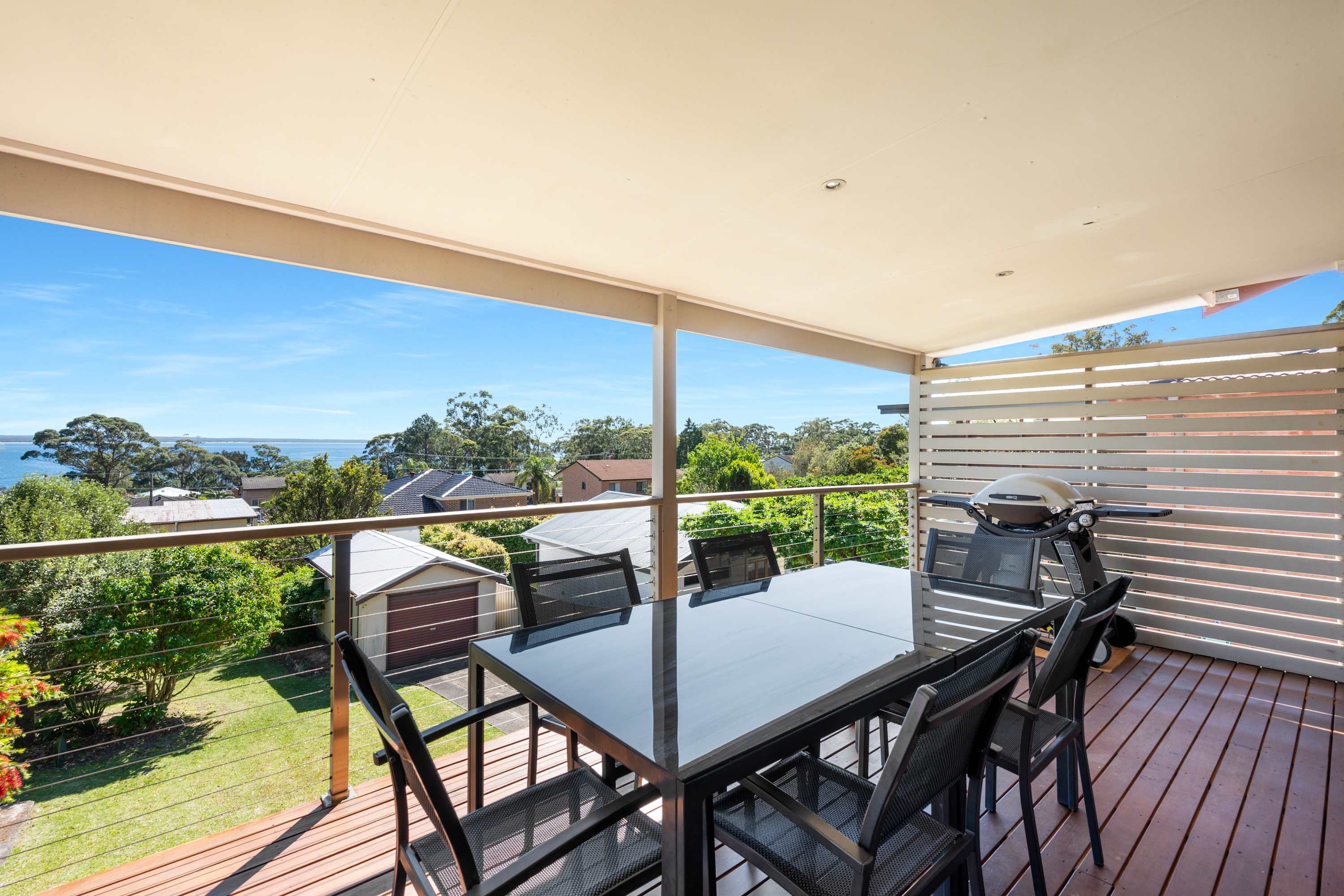 Outside, the elevated balcony offers a peaceful setting for alfresco dining, complete with an eight-seater outdoor table and a gas BBQ. Whether you're enjoying a morning coffee with a breeze or winding down with a sunset dinner, this inviting outdoor space is made for relaxed holiday living.