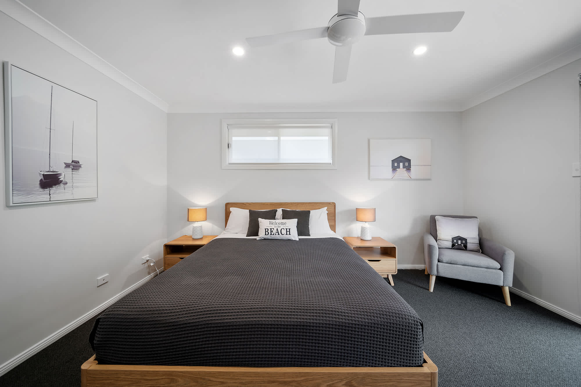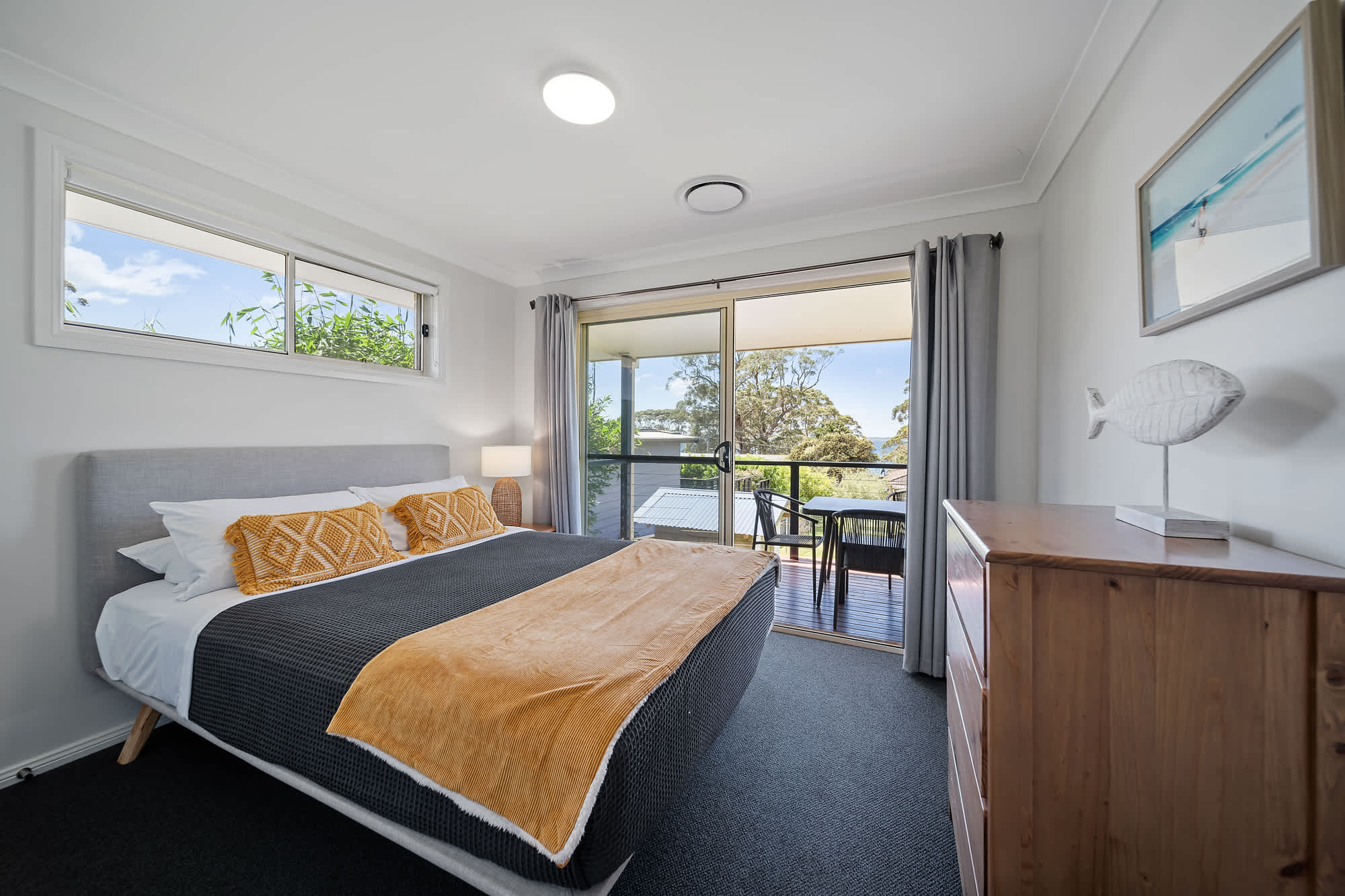 Bedroom 2: Queen bed, ceiling fan, built-in robe, balcony access.