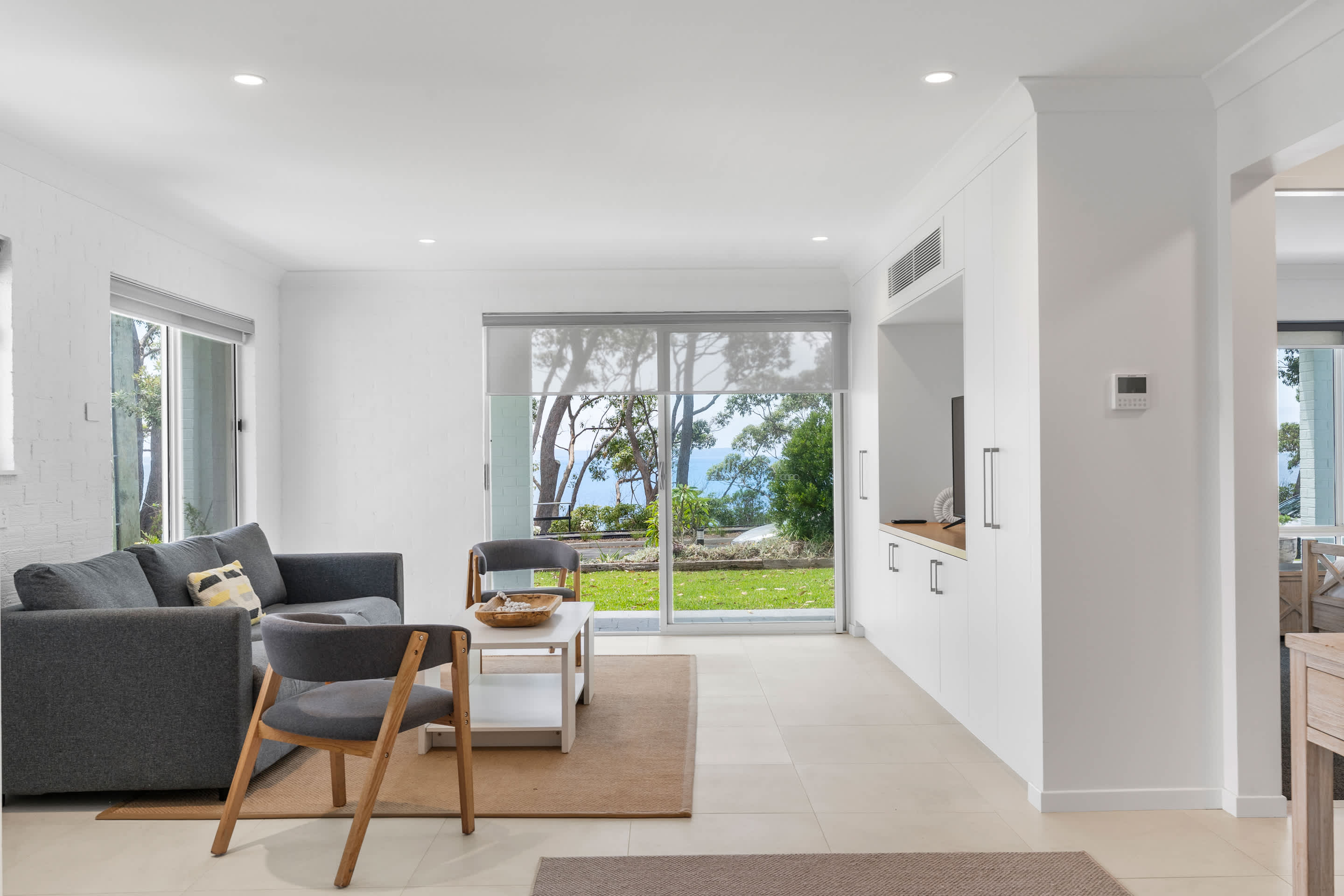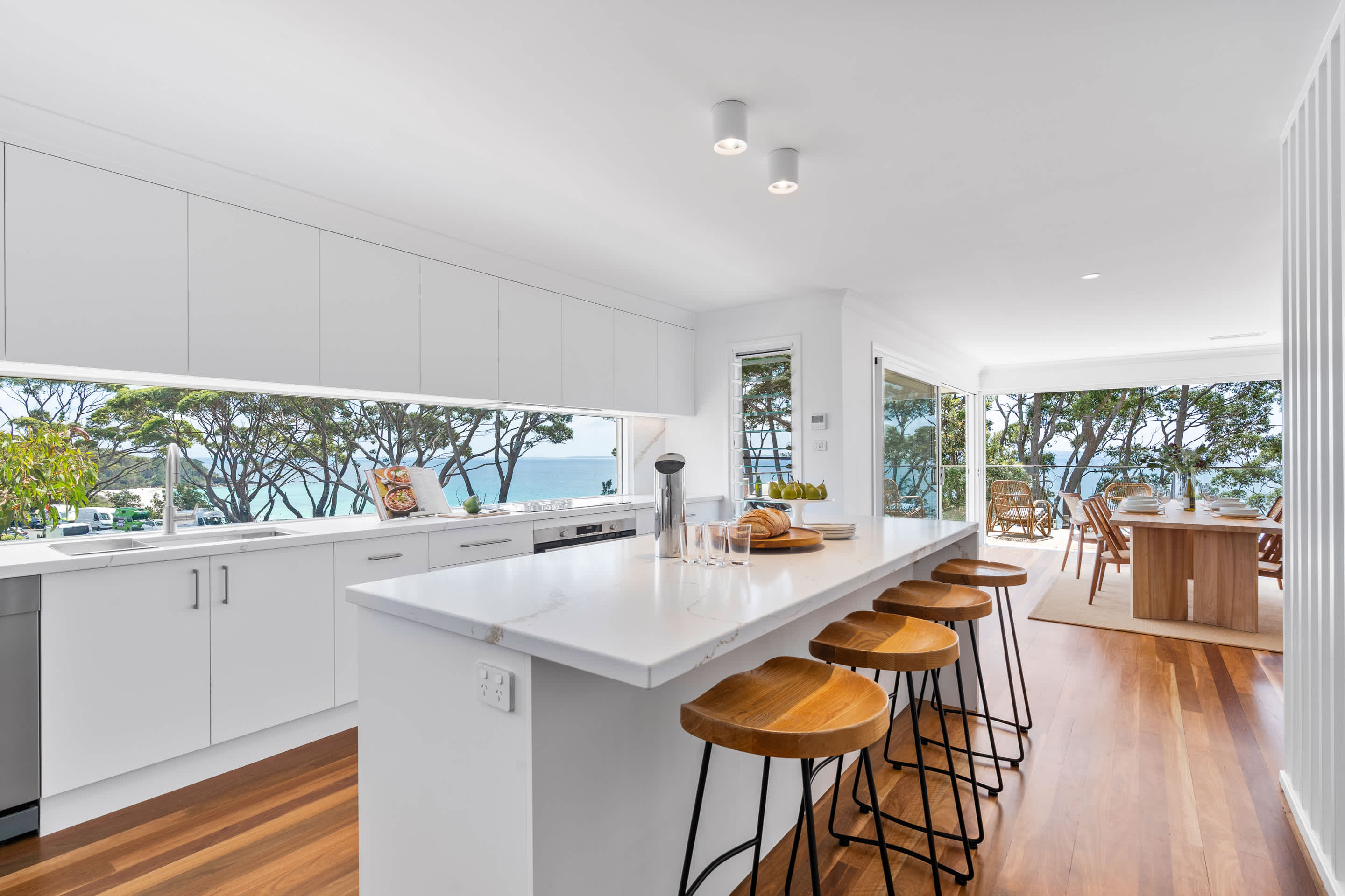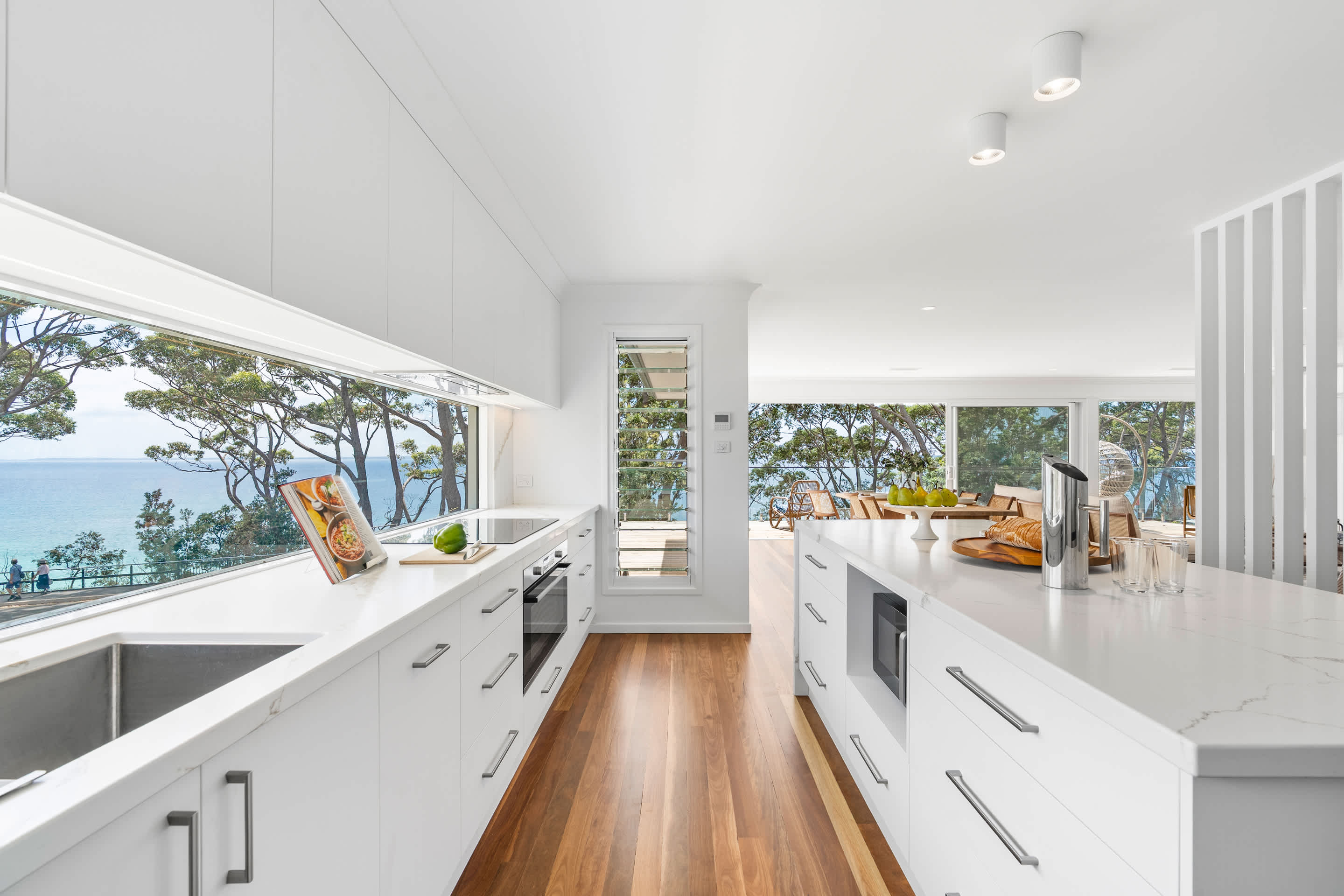 The upper level features open-plan living, dining, and a brand new kitchen with sweeping bay views and direct access to a large deck, perfect for alfresco meals, sunset drinks, and relaxing in the sea breeze. The kitchen is well equipped with a French-door fridge/freezer, induction cooktop, dishwasher, and quality appliances. A second living area on the ground floor provides additional space for kids to unwind or for quieter downtime