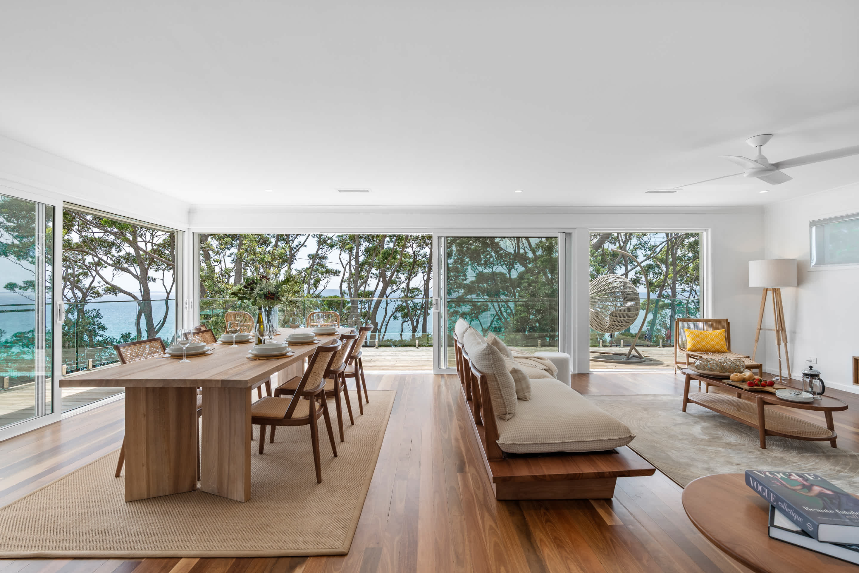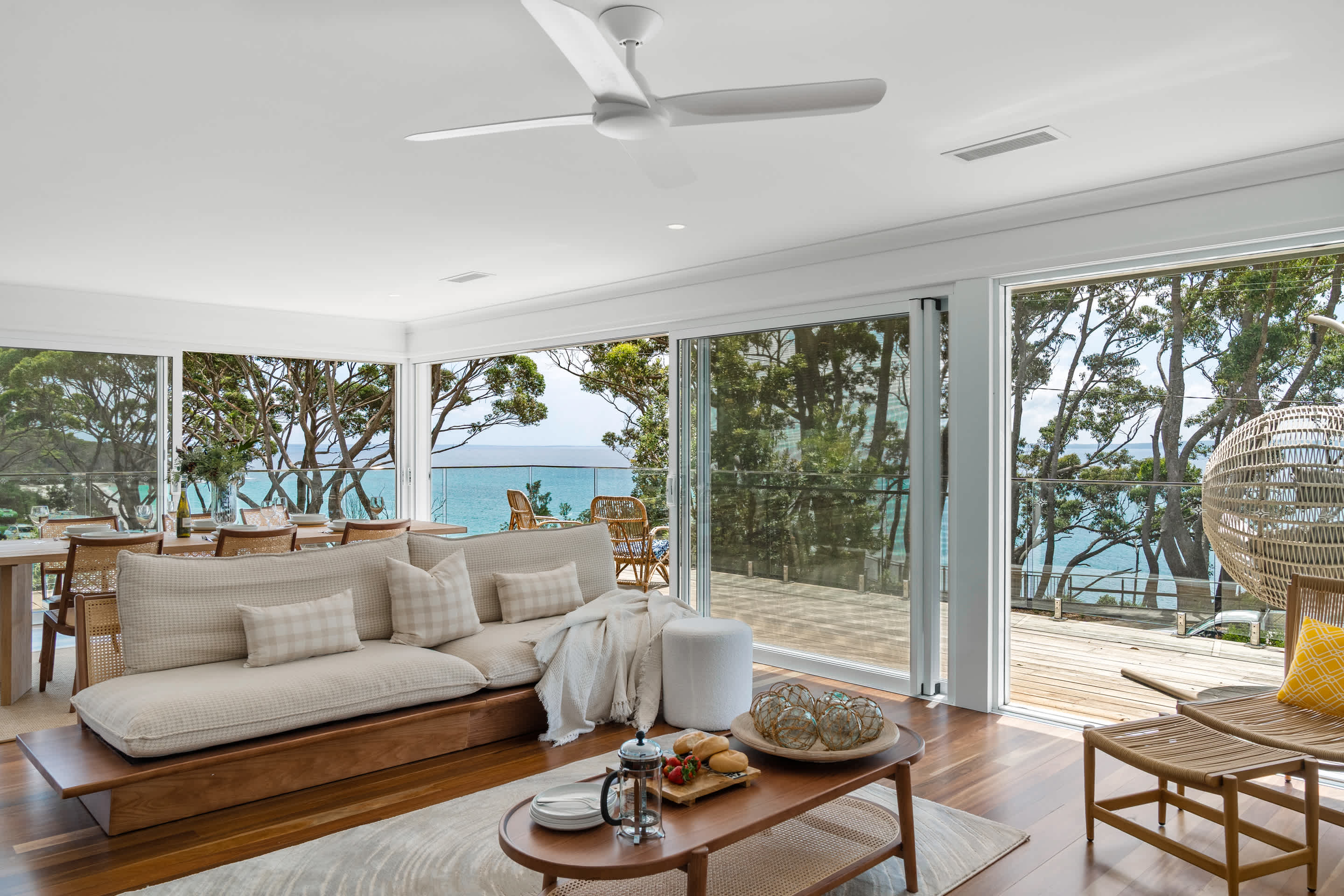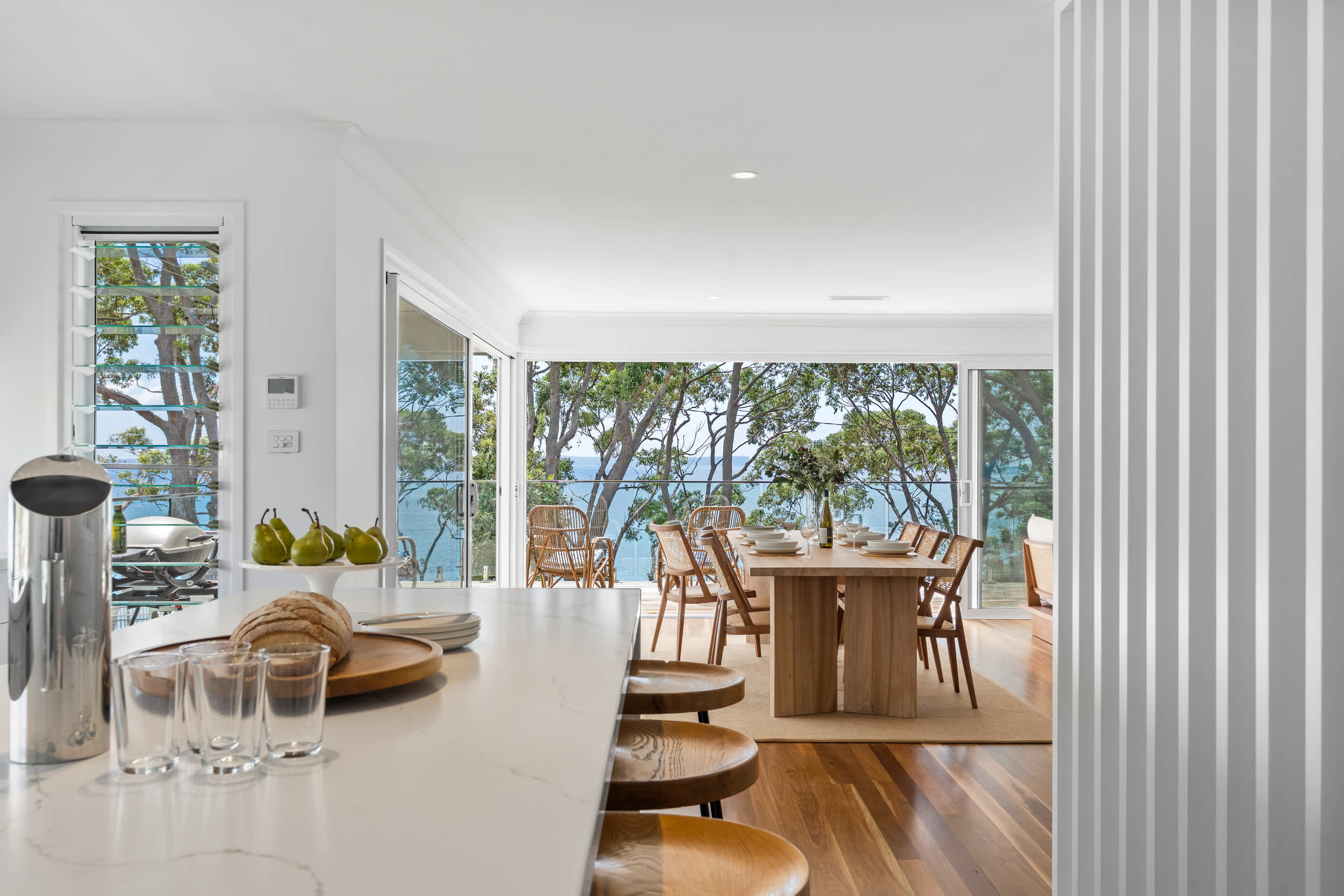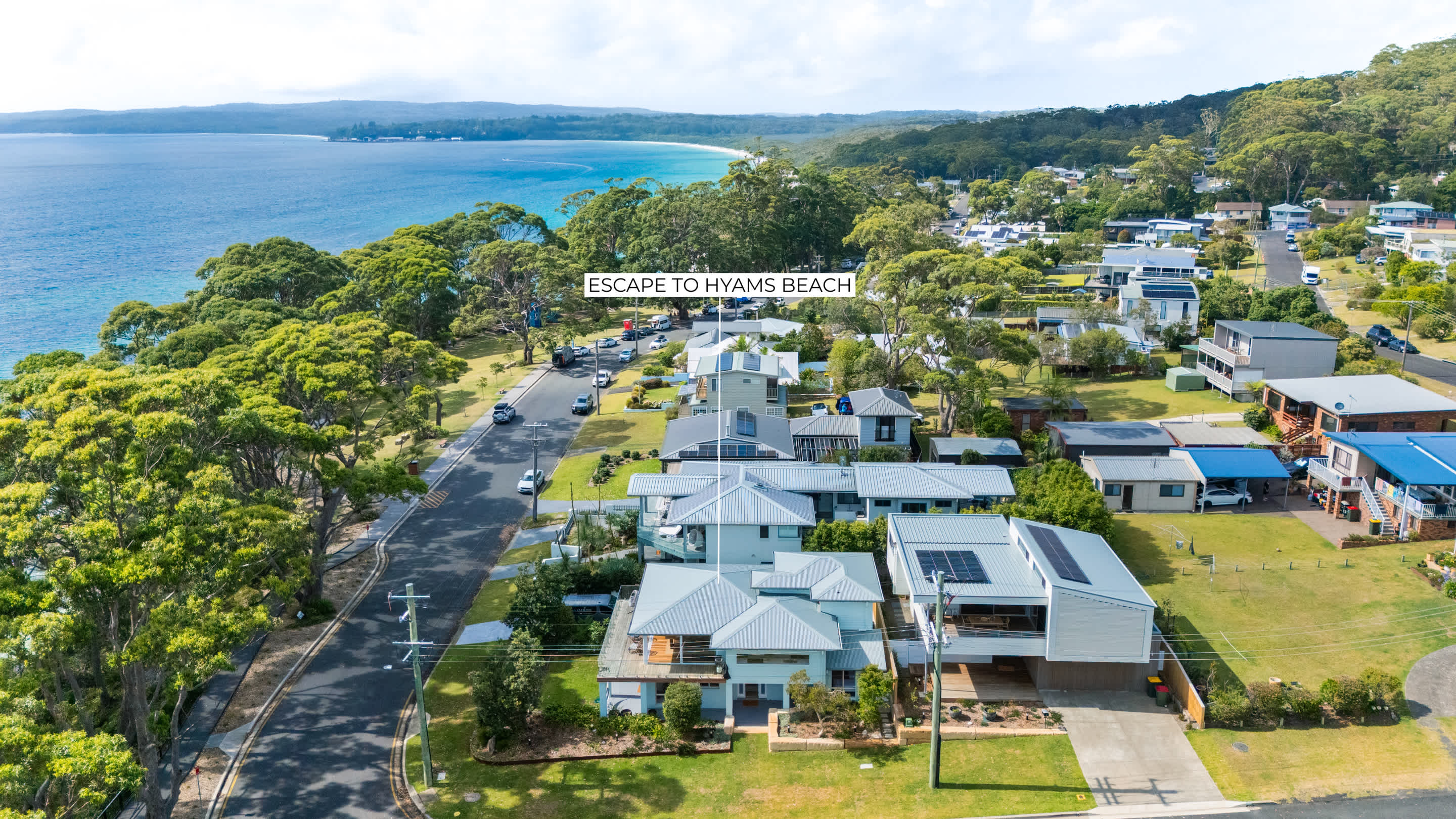 Welcome to Escape to Hyams Beach, a fully renovated five-bedroom coastal retreat set across three spacious levels with expansive views over Jervis Bay. Ideal for families and relaxed group stays, this light-filled home offers multiple living areas, ducted air conditioning, and beautiful indoor–outdoor flow, all just moments from the white sands of Hyams Beach.