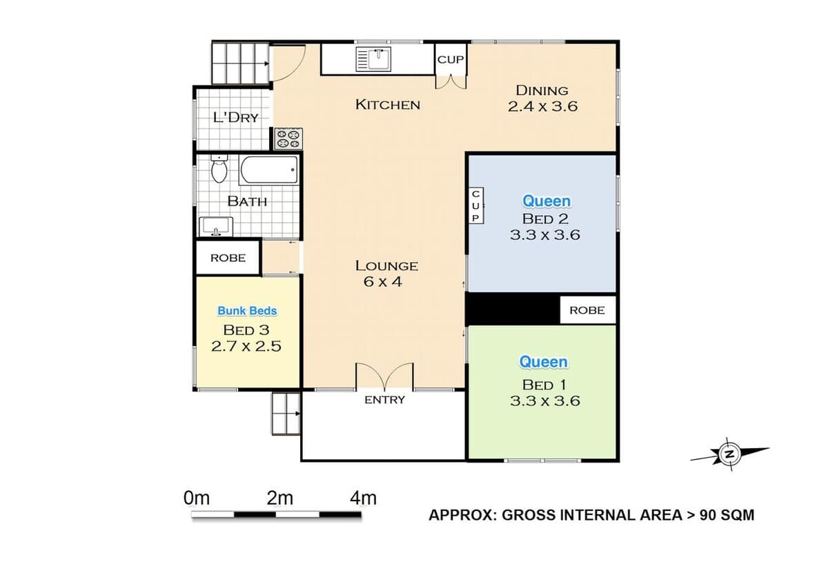 - Bedroom 2: Queen bed, Robe